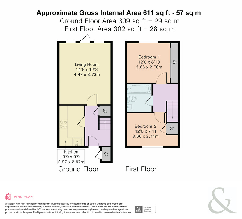 The ground floor boasts a spacious reception area, ideal for both living and dining, while the kitchen, positioned at the rear, offers direct access to a sun-drenched garden with a paved patio—perfect for outdoor relaxation. The first floor accommodates two well-lit double bedrooms with ample storage, along with a modern family bathroom featuring a bath with shower attachment, toilet, and hand basin.